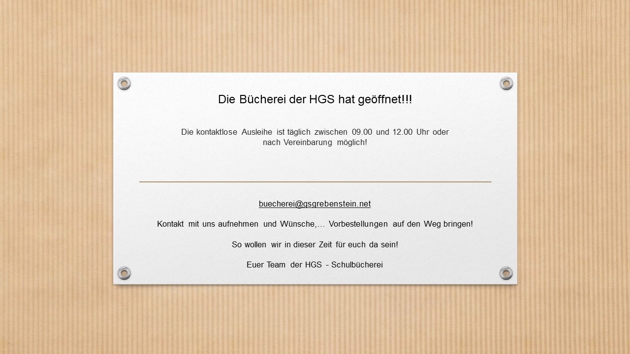 Zeitlicher Umfang: 12 – 15 Stunden wöchentlich, jeden Vormittag Aufgabenbereich: Ausleihe von Medien und Büchern, Überwachung der Medienrückgabe, Einpflegen neuer Bücher, Anschaffung neuer Bücher, ggf. Organisation von Lesungen, Unterstützung bei besonderen schulischen